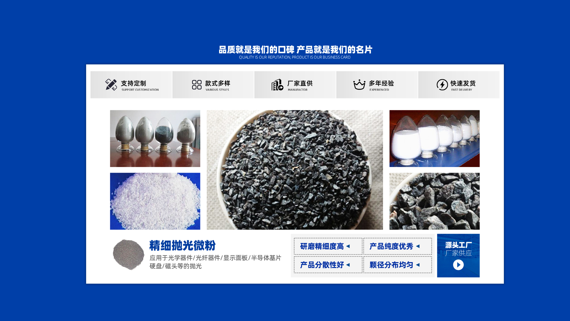 公司另外提供陶瓷砂輪專(zhuān)用砂,粒度有8#、10#、12#、14#、16#、20#、 24#、30#、36#至325#各種目數(shù)均可提供。是砂輪廠(chǎng)、耐火材料廠(chǎng)、噴砂、除銹廠(chǎng)的產(chǎn)品。